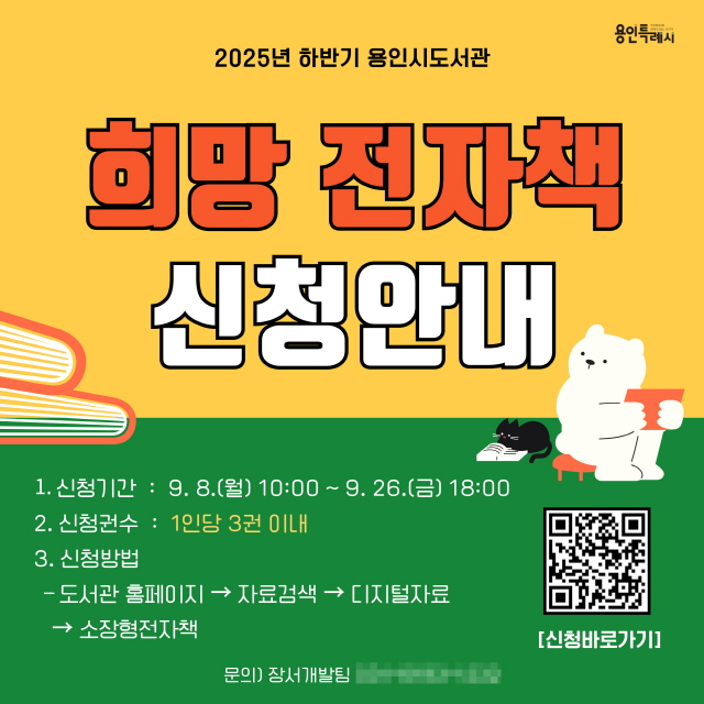 (경기=NSP통신) 김병관 기자 = 경기 용인특례시(시장 이상일)는 오는 8일부터 26일까지 상반기에 이어 하반기 전자책 희망 도서 신청을 받는다.
