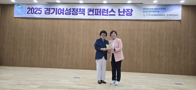 NSP통신-3일 경기도의회 대회의실에서 열린 2025년 경기여성정책 컨퍼런스에서 박옥분 의원(오른쪽)이 감사패 수상 기념촬영을 하고 있다. (사진 = 의원실)