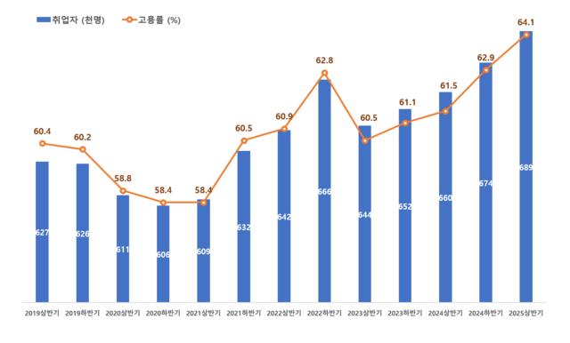 시는 2024년 하반기에 역대 최고 고용률(62.9%)을 달성했고 반기 만에 최고치를 경신했다. 고용률은 2023년 상반기(60.5%) 이후 꾸준히 상승했다.