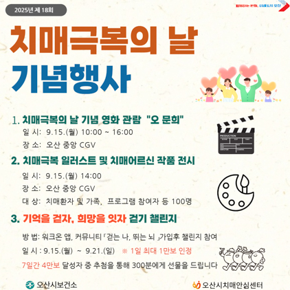 기념행사에는 ▲오산 중앙 CGV에서의 치매 관련 영화 관람 ▲모바일 걷기 앱 ‘워크온’을 활용한 걷기 챌린지 ▲치매 예방수칙 3.3.3 실천 다짐 판넬 투표 등 다양한 프로그램이 마련돼 시민들의 참여를 기다리고 있다.