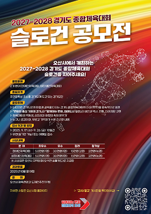 (경기=NSP통신) 조현철 기자 = 경기 오산시(시장 이권재)가 17일부터 26일까지 ‘2027~2028년 경기도종합체육대회 슬로건 공모전’을 진행한다.