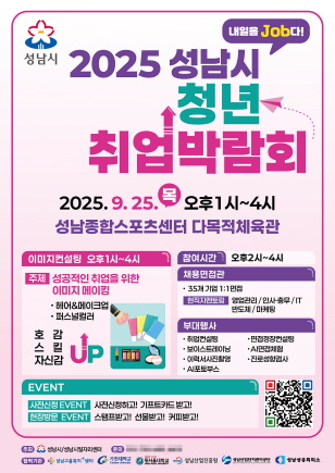 (경기=NSP통신) 김병관 기자 = 경기 성남시(시장 신상진)는 오는 25일 오후 1시부터 4시까지 성남종합스포츠센터 1층 다목적체육관에서 ‘2025 성남시 청년 취업박람회’를 개최한다.