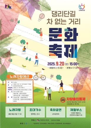 풍성한 볼거리와 즐길 거리가 가득한 축제의 장에서 가족, 이웃과 함께 깊어가는 가을의 정취를 만끽하며 잊지 못할 추억을 만들어보는 것은 어떨까?