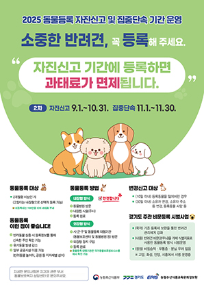 시는 자진신고 기간 종료 후 11월 1일부터 30일까지 ‘동물등록 집중 단속 기간’을 운영한다. 등록대상 동물을 등록하지 않은 소유자에게는 100만원 이하 과태료가 부과된다.