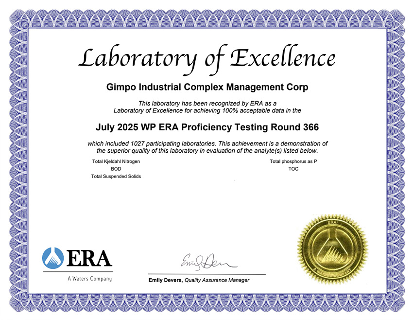 김포산업단지관리공단은 양촌공공폐수처리시설 수질분석 분야에서 모든 항목 최고등급인 ‘만족(Satisfactory)’을 받아 분석능력과 데이터 품질이 국제적으로 입증됐다.