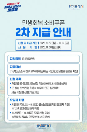 정명근 화성시장은 “1차 사업에서 보여준 높은 참여율과 소비 촉진 효과를 바탕으로 이번 2차 사업은 취약계층과 군 장병까지 포괄하는 촘촘한 지원 체계를 갖췄다”며 “민생 안정과 소상공인 활력이라는 두 가지 목표를 동시에 달성하겠다”고 말했다.