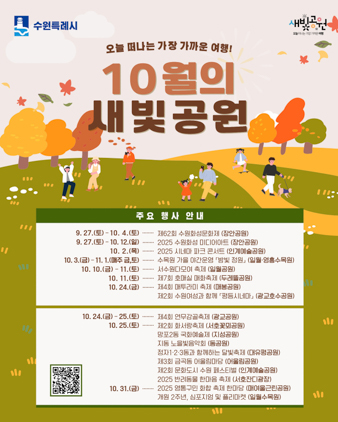이재준 수원시장은 “시민들이 공원을 언제든지 편하게 찾고 다양한 프로그램을 즐길 수 있도록 꾸준히 발전시키겠다”며 “10월 한 달 동안 공원 곳곳에서 열리는 마을축제와 문화 행사가 시민들에게 가장 가까운 여행이 되길 바란다”고 말했다.