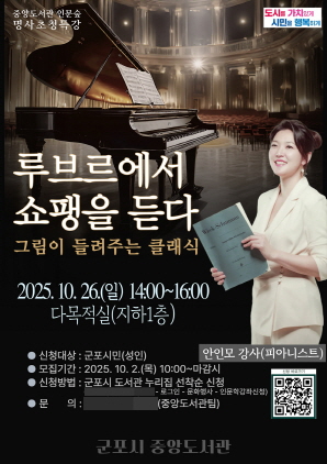 윤주헌 중앙도서관장은 “음악과 미술, 그리고 인문학이 어우러진 이번 강연이 시민 여러분의 일상에 새로운 울림을 전해 주기를 바란다”고 전했다.