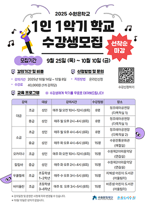 수원문화재단 관계자는 “평소 관심이 있던 악기를 직접 배우고 연주해 보며 일상에 예술적 감성을 더할 수 있는 계기가 되기를 기대한다”며 “악기를 처음 접하는 분들도 쉽게 참여할 수 있도록 초급과정과 악기 대여 서비스를 마련했으니 많은 관심과 참여를 바란다”고 말했다.