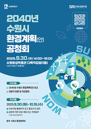 2040년 수원시 환경계획은 2026년부터 2040년까지 15년간 적용될 중장기 계획이다. 수원시정연구원이 용역을 수행하고 있으며 계획안에는 ▲환경계획의 비전과 목표 ▲세부 지표 설정 ▲공간환경계획 수립 등이 포함된다. 공청회는 계획안 발표, 전문가 토론, 의견 청취 순으로 진행된다.
