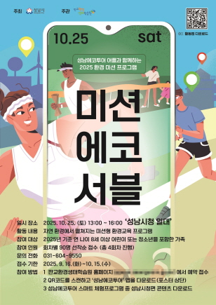 (경기=NSP통신) 김병관 기자 = 경기 성남시(시장 신상진)는 오는 25일 오후 1~4시 시청 곳곳에서 가족 단위 초·중학생 120개 팀(팀당 2~4명, 총 360명)이 참여하는 ‘미션에코서블’ 프로그램을 진행한다.