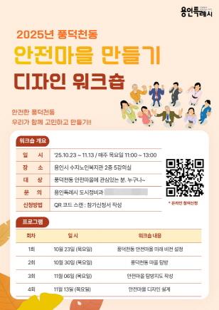 (경기=NSP통신) 김병관 기자 = 경기 용인특례시(시장 이상일)는 수지구 풍덕천동 ‘안전마을 만들기 디자인 워크숍’ 참가자를 모집 중에 있다.