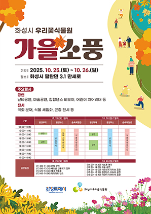 정명근 화성시장은 “이번 가을소풍 행사는 일상에 지친 시민들에게 자연과 문화가 어우러진 힐링의 시간이 될 것”이라며 “우리 꽃의 아름다움과 생태 보존의 중요성을 알리고 우리꽃식물원을 시민의 삶에 자연과 문화의 향기가 깃드는 공간으로 발전시켜 나가겠다”고 말했다.