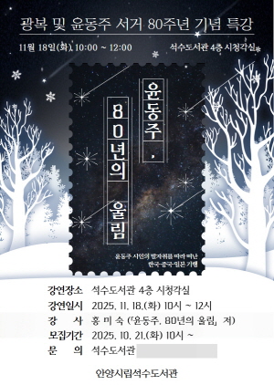 석수도서관 관계자는 “이번 광복 80주년 기념 특강 ‘윤동주, 80년의 울림’을 통해 시민들이 광복의 역사적 의미를 되새기고 윤동주 시인의 작품 속 문학적인 맥락을 더욱 깊이 이해하는 시간이 되었으면 좋겠다”고 밝혔다.