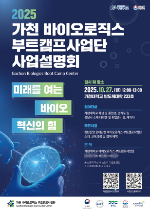 (경기=NSP통신) 김병관 기자 = 경기 성남시(시장 신상진)는 오는 27일 낮 12시부터 1시까지 가천대학교 반도체대학 233호에서 ‘2025 가천 바이오로직스 부트캠프 사업단 설명회’를 연다.