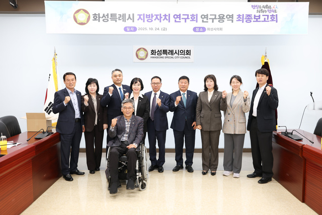오문섭 대표의원은 “이번 연구용역 최종보고회를 통해 화성특례시에 걸맞은 재정 운영 체계와 정책 방향을 구체화할 수 있었다”며 “지속적인 연구와 역량 강화로 지방의회의 정책 기능을 한층 높이고 시민이 체감할 수 있는 실효성 있는 정책 대안을 마련하는데 최선을 다하겠다”고 말했다.