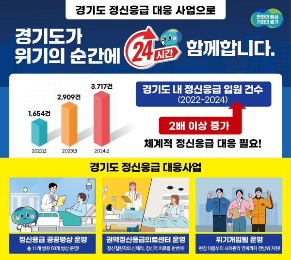 (경기=NSP통신) 김병관 기자 = 최근 정신응급입원 환자의 급격한 증가에 따라 경기도가 정신응급 공공병상 확충과 위기개입팀 운영 등 ‘정신응급 대응 사업’을 적극 추진에 나섰다.