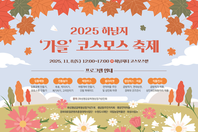 하남지 가을 코스모스 축제는 화성행궁골목형상점가상인회가 주관하고 행궁공방거리상인회·언덕마을 작가·행궁동주민자치회·경희대학교 로컬콘텐츠중점대학사업단·수원도시재단·국립농업박물관 등 기관들이 협업한다. 행궁동 지역 영상 작가들은 이날 축제를 촬영해 기록을 남길 예정이다.