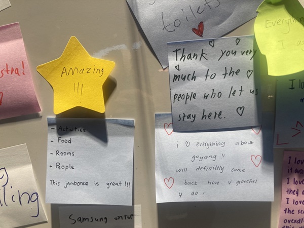 특히 11일 스카우트 대원들은 작별을 앞두고 감사의 뜻을 담은 메모를 남겼다. 대원들은 “여기에 머무르게 해주어 감사 드린다·한국의 음식, 사람, 경치를 사랑하고 10전 만점에 10점 주고 싶다·환대를 받아 매우 감사하며 이곳에 꼭 다시 오고 싶다·나는 여기에 살고 싶다”는 등 헤어지는 아쉬움을 나타냈다.