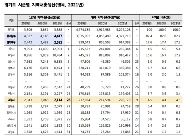 1인당 지역내총생산을 살펴보면 경기도 전체는 3888만 원, 경기남부는 4417만 원, 경기북부는 2622만 원으로 남부의 60% 수준에 그쳐 격차가 큰 것으로 나타났다. 고양시는 경기북부를 대표하는 도시 중 하나지만 경기도 31개 시군 중 지역내총생산 9위, 1인당 지역내총생산 26위에 그쳤다. 의정부시 또한 지역내총생산 21위, 1인당 지역내총생산 31위에 머물렀다.