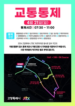 ‘2024 고양특례시-JTBC 하프 마라톤 대회’가 21일 개최됨에 따라 고양종합운동장 인근, 고양대로, 경의로, 호수로 등 고양시 주요 도로의 교통이 통제된다. 통제 시간은 오전 7시 30분부터 11시다.