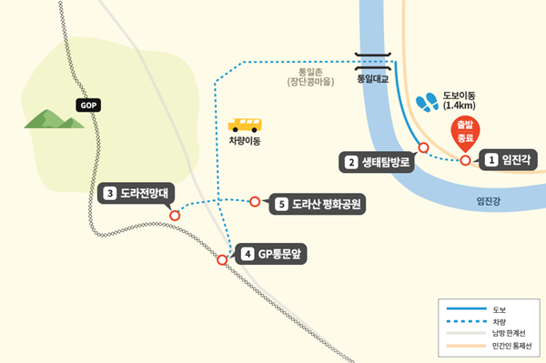 평일 오전과 주말에 이용할 수 있는 1코스는 임진각부터 출발해 생태탐방로, 도라전망대, 도라산평화공원을 둘러보는 여정이며 ▲평일 오후에는 운영되는 2코스는 기존 1코스에 남북출입사무소(출입경)와 도라산역을 경유하는 노선이 추가된 여정이다.