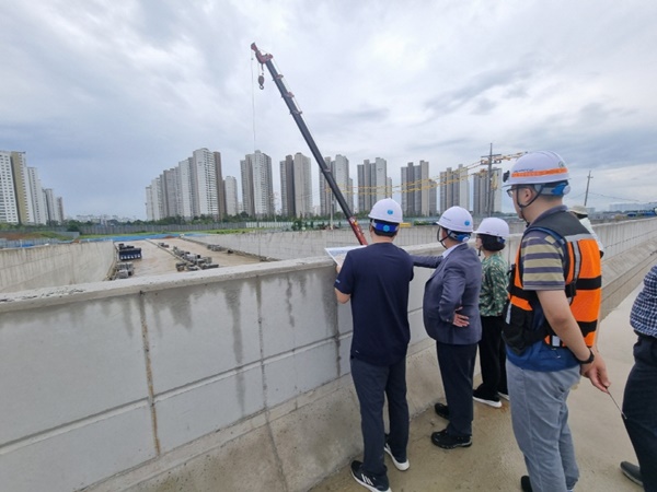 이날 김진기 부시장은 30도를 넘나드는 폭염에도 적기 개통을 위해 구슬땀을 흘리는 근로자들을 격려하고 작업 여건을 살폈다.