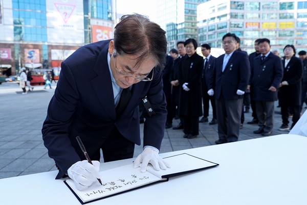 이동환 고양특례시장은 31일 시 간부 공무원들과 함께 화정역 광장 분향소를 방문해 헌화와 묵념으로 여객기 참사 희생자들을 애도했다. 이 시장은 조문록에 ‘삼가 고인의 명복을 빕니다’라고 적었다.