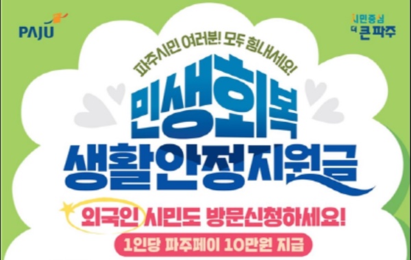 (서울=NSP통신) 강은태 기자 = 파주시가 침체된 지역경제 활성화를 위해 외국인 결혼이민자(F-2-1, F-6)와 영주권자(F-5) 대상으로 ‘민생 회복 생활 안정지원금’을 지급한다.