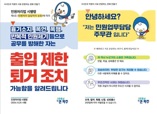 김경일 파주시장은 “정당한 사유 없는 악성 민원인의 폭언, 폭행, 업무방해 등 위법행위에 관해 무관용 원칙으로 시 차원에서 강력히 대응할 것이다”며 “민원인과 공무원이 서로 존중하는 올바른 민원 문화 정착을 위해서도 적극 노력하겠다”고 말했다.