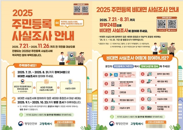 (서울=NSP통신) 강은태 기자 = 고양시(특례시장 이동환)가 7월 21일부터 오는 11월 26일까지 고양시 전 세대를 대상으로 ‘2025년 주민등록 사실조사’를 실시한다.