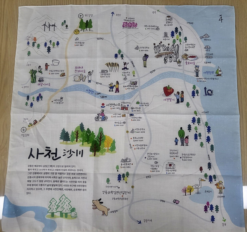 생활안내지도 손수건에는 사천의 주요 관광지를 비롯해 공공기관 및 학교 등의 대략적인 위치와 전화번호를 담아 사천이 낯선 전입자와 인터넷 검색이 어려운 어르신들이 편리하게 이용할 수 있도록 했다.