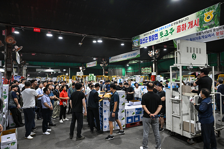 오후 10시 30분 본격적인 경매가 시작되기에 앞서 최 군수는 직접 경매대에 올라 “정선군의 풋고추가 우수한 품질에 걸맞은 제값을 받아 대한민국 최고의 명품 고랭지 풋고추로 거듭날 수 있도록 군에서도 실질적 지원을 검토해 나갈 것이며 시장에서 그 가치를 더욱 인정받아 농가들이 더 높은 가격을 받을 수 있도록 모두가 최선을 다해 달라”고 말했다.
