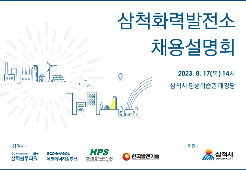 (강원=NSP통신) 조이호 기자 = 강원특별자치도 삼척시(시장 박상수) 삼척화력발전소 4개사 채용설명회가 오는 17일 오후 2시 삼척시 평생학습관 대강당에서 진행된다.