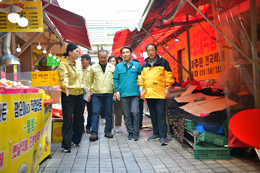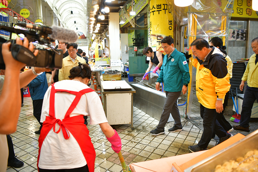 (강원=NSP통신) 조이호 기자 = 김진태 강원특별자치도지사가 11일 제6호 태풍 카눈에 따른 집중호우로 피해를 입은 속초시를 방문했다. 김진태 도지사는 이병선 속초시장과 속초관광수산시장 침수 피해을 입은 상가를 찾아 상인들을 위로하고 건의 사항을 청취했다.