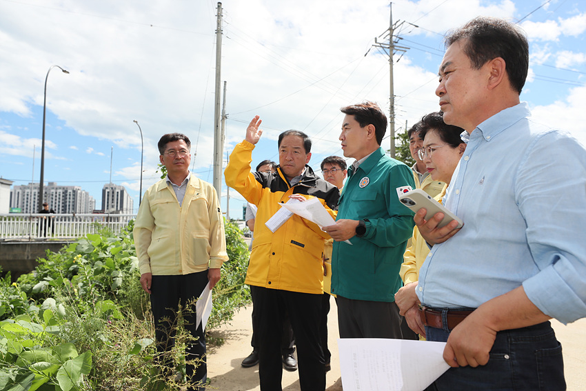김진태 지사는 소야교를 방문해 청초천 우측의 침수된 농경지 상황을 확인 점검했다. 청초천은 범람 수위를 단 30cm 까지 남겨둘 만큼 급박한 상황이었으나 다행히 범람하지 않았다.