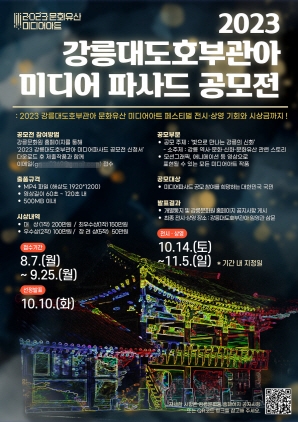 (강원=NSP통신) 조이호 기자 = 강원특별자치도 강릉시(시장 김홍규) 강릉문화원(원장 최돈설)이 오는 10월 14일 ~ 11월 5일까지 진행될 강릉대도호부관아 문화유산 미디어아트사업의 연계 프로그램 ‘2023 강릉대도호부관아 미디어파사드 공모전’에 참가할 전국 참가자를 9월 25일까지 모집한다.