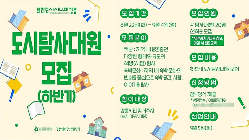 (강원=NSP통신) 조이호 기자 = 강원특별자치도 강릉시(시장 김홍규) 강릉문화도시지원센터가 강릉의 매력을 찾고 기록하고 공유하는 도시탐사대원을 9월 4일까지 모집한다.