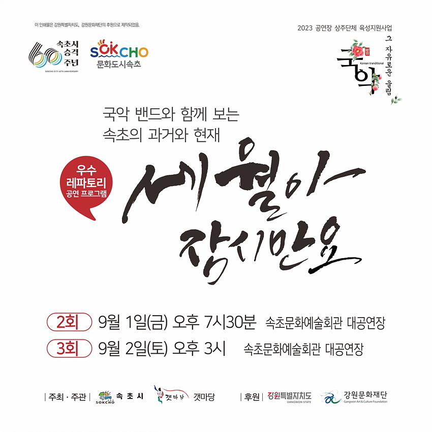 (강원=NSP통신) 조이호 기자 = 강원특별자치도 속초시(시장 이병선) 갯마당이 속초문화예술회관 대공연장에서 ‘국악, 그 자유로운 울림’의 우수 레퍼토리 ‘세월아 잠시만요’를 공연한다.