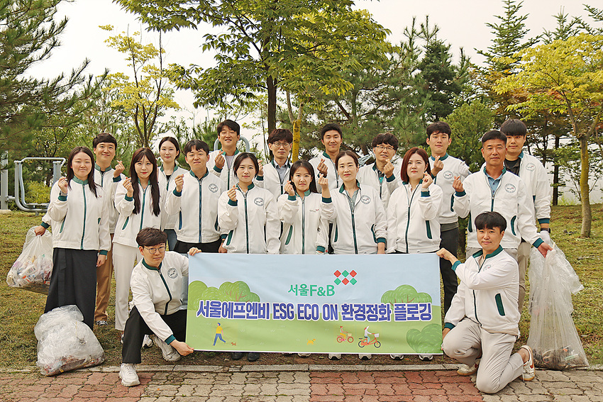 NSP통신-서울에프엔비 임직원들이 지역사회 환경정화를 위한 ECO ON 플로깅을 진행하고 기념사진 촬영을 하고 있는 모습. (사진 = 서울에프엔비)