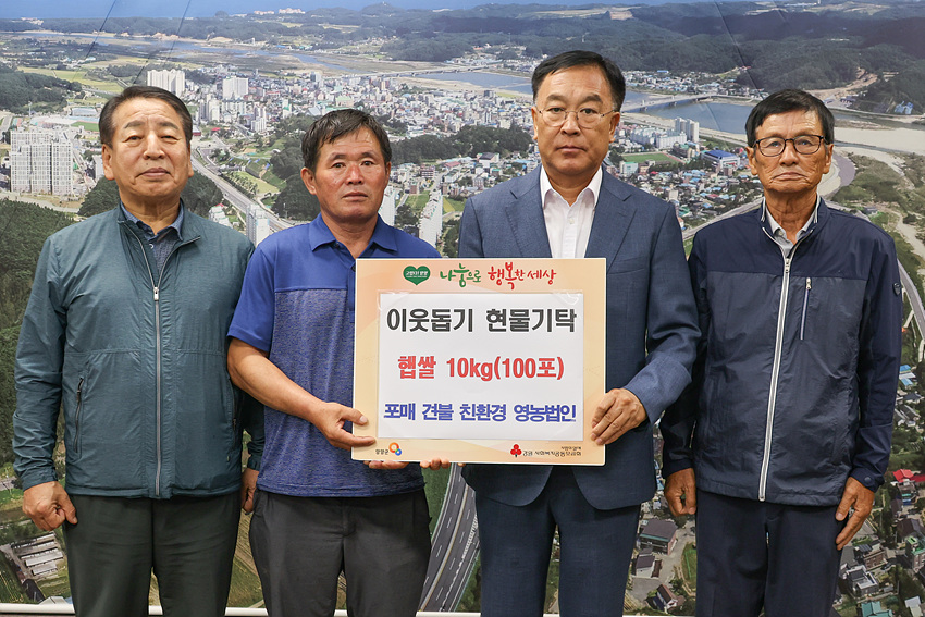 이어 포매 견불 친환경 영농법인(이장 조병일)에서도 지난 20일 군청을 방문해 관내 보훈가구 및 저소득층을 위해 햅쌀 10kg 100포를 기탁했으며 해준푸드(대표 김정대)는 25일 관내 어려운 한부모 가구를 돕기 위해 라면 20박스를 기탁했다.