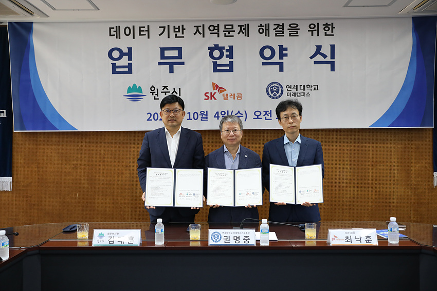 (강원=NSP통신) 조이호 기자 = 강원특별자치도 원주시(시장 원강수)가 연세대, SK텔레콤이 4일 연세대학교 미래캠퍼스에서 ‘데이터 기반 지역 문제 해결’을 위한 3자 업무협약을 체결했다.