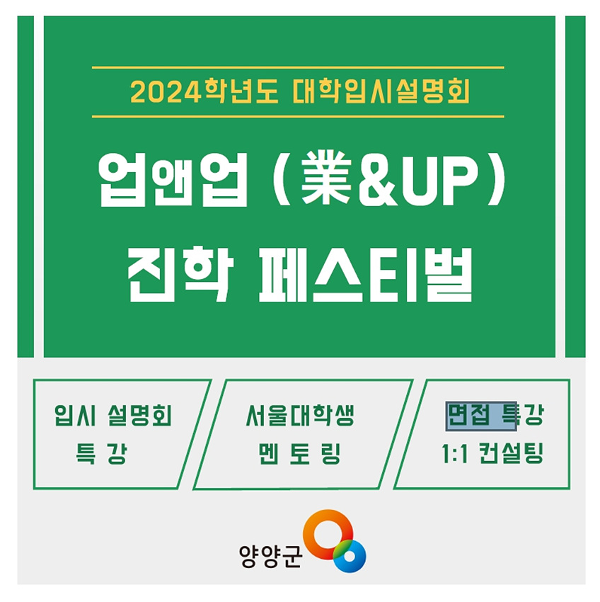(강원=NSP통신) 조이호 기자 = 강원특별자치도 양양군(군수 김진하)이 오는 14일 오후 2시 양양군청소년수련관 공연장에서 관내 초·중·고등학생 및 학부모를 대상으로 ‘2024학년도 대학입시 설명회 하반기 면접특강’을 개최한다.