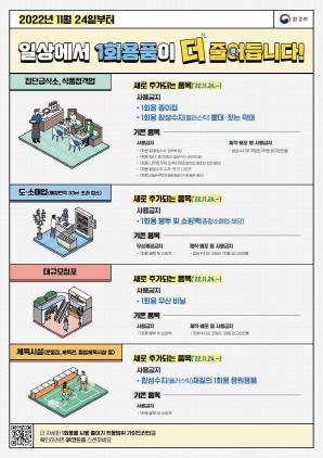 주요 내용은 ▲식품접객업·집단급식소 내 1회용 종이컵, 1회용 플라스틱 빨대·젓는 막대 이용 금지, 식품접객업(음식점 및 주점업)에서 1회용 비닐봉투 및 쇼핑백 무상제공 금지 ▲제과점과 종합소매업 1회용 비닐봉투 및 쇼핑백 이용이 금지 ▲대규모 점포(매장면적 3000㎡ 이상) 1회용 우산 비닐 이용 금지 ▲체육시설에서 합성수지재질 이외의 1회용 응원용품 무상제공 금지, 합성수지재질의 1회용 응원용품(막대풍선, 비닐방석 등) 이용 금지 등이다.
