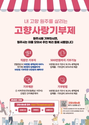 (강원=NSP통신) 조이호 기자 = 강원특별자치도 원주시(시장 원강수)가 ‘2024년도 원주시 고향사랑기부제 답례품 및 공급업체’를 공개 모집한다.