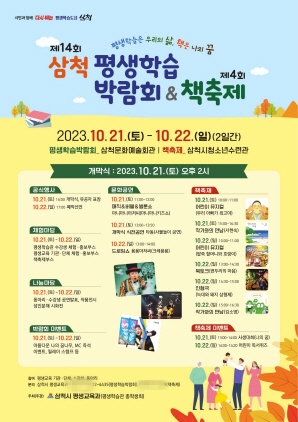 시 관계자는 “제14회 삼척평생학습박람회 및 제4회 책축제를 통해 평생학습도시, 책 읽는 도시로서 참여자들이 학습한 경험과 결과물을 공유하고 우수사례를 널리 홍보해 학습을 통해 얻은 행복 에너지를 맘껏 발산하길 바라며 이번 행사에 시민들의 많은 참여와 관심을 바란다”라고 말했다.
