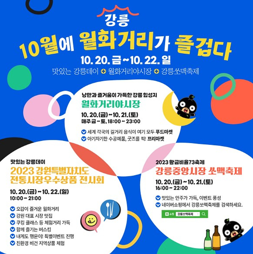 강원 전통시장 우수상품 전시회가 구한전 옆 월화거리에서 20~22일까지 펼쳐지며 20~21일에는 월화거리야시장이 오후 6시부터, 2023 황금비율 7:3 쏘맥축제가 강릉중앙시장에서 오후 4시부터 진행된다.