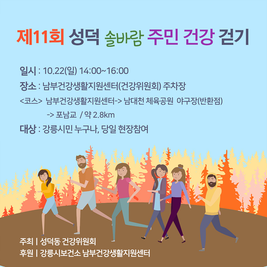 (강원=NSP통신) 조이호 기자 = 강원특별자치도 강릉시(시장 김홍규) 성덕동 건강위원회(위원장 이흥철)가 오는 22일 오후 2시 성덕동 일대 조성된 남대천 걷기 코스에서 ‘제11회 성덕 솔바람 주민 건강 걷기’ 행사를 개최한다.