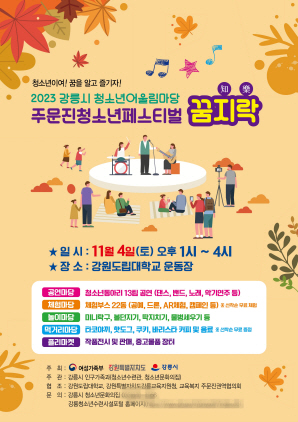 (강원=NSP통신) 조이호 기자 = 강원특별자치도 강릉시(시장 김홍규)가 오는 4일 강원도립대학교 운동장에서 청소년들이 자유롭게 예술적 재능과 역량을 발휘하고 직접 체험하며 즐길 수 있는 주문진 청소년페스티벌 ‘꿈지락’을 개최한다.