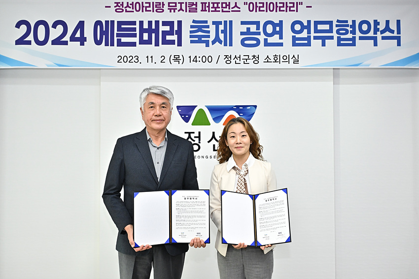협약식에는 최승준 군수, 안석균 시설국장, 최종수 아리랑문화재단이사장, 권은정 글로벌교류문화위원장, 윤정환 아리아라리 연출 감독 등 10여명이 참석해 2024년 영국 에든버러 페스티벌 코리아시즌 공연 협력사업 추진을 위한 업무협약을 체결했다.